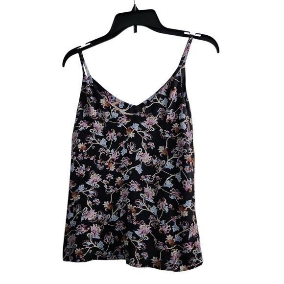 A chic floral cami top, perfect for adding a touch of elegance to your casual wardrobe. This sleeveless blouse features a flattering V-neck design and a vibrant multicolor floral pattern against a black background. Its lightweight fabric makes it ideal for warm weather, while the adjustable spaghetti straps ensure a comfortable fit. Dress it up with a skirt for a night out, or pair it with jeans for a relaxed weekend brunch.